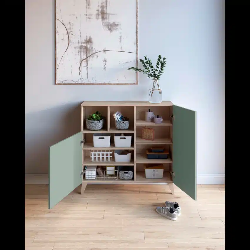 Ce porte chaussures moderne fabriqué en Tunisie peut aussi servir de petit buffet d’appoint dans une chambre ou un bureau. Son mélange chêne clair/vert pastel se marie facilement avec les intérieurs contemporains, ce qui le rend idéal pour un design de porte moderne pour chaussures, alliant style et praticité.